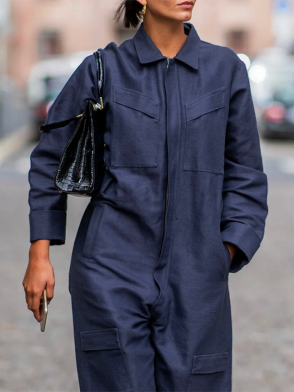 Long Sleeves Loose Solid Color Zipper Lapel Jumpsuits