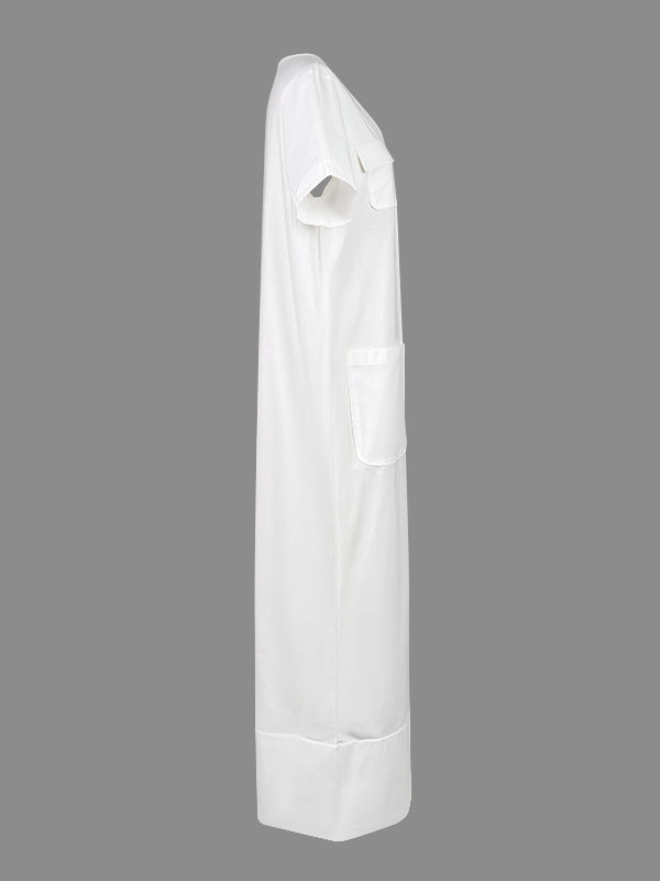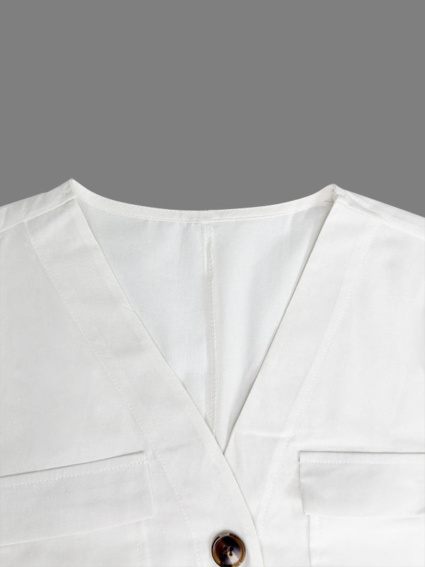 Loose Short Sleeves Buttoned Pockets Solid Color V-Neck Jumpsuits